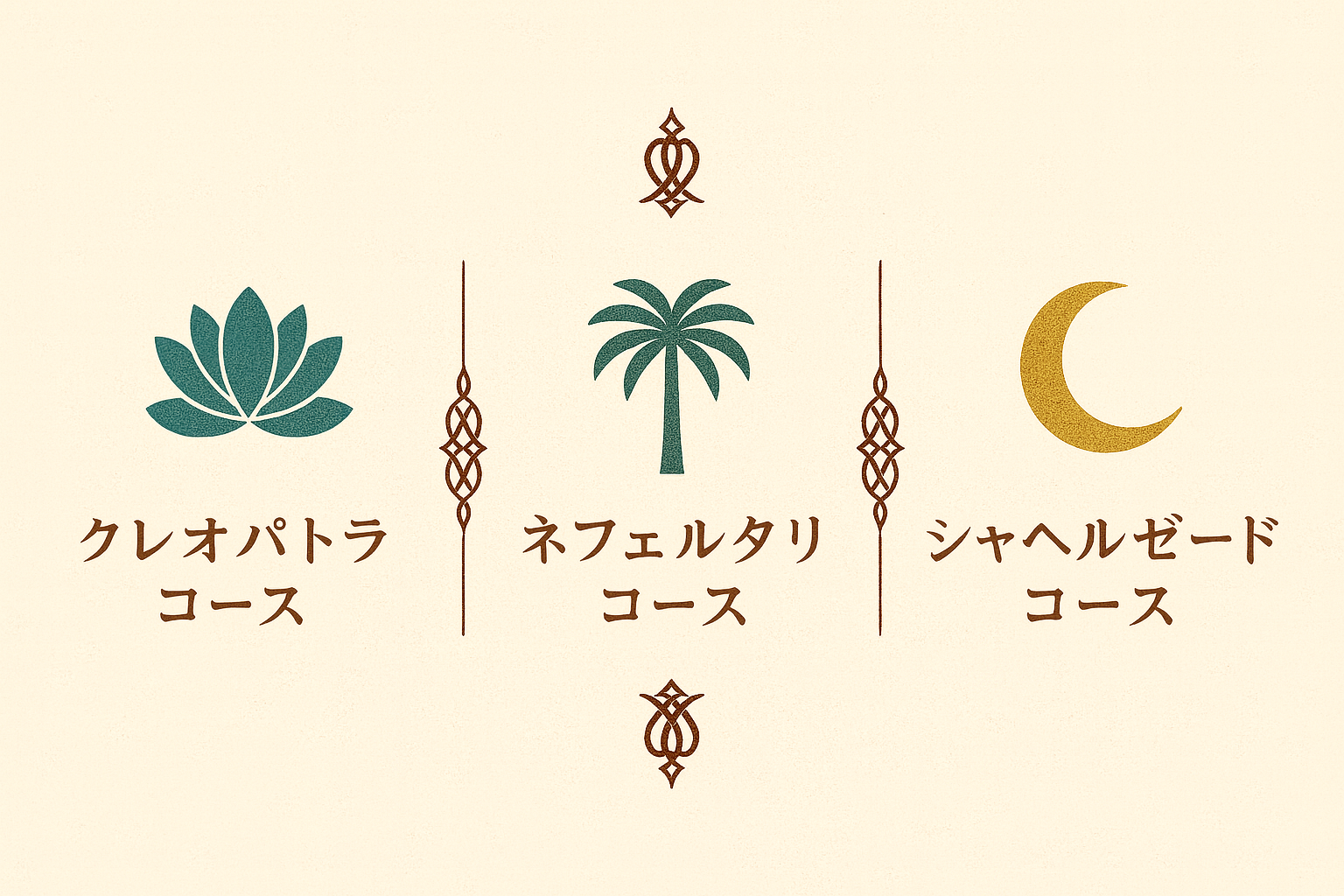 それぞれのコースは「美」と「叡智」を象徴する中東の古代女王たちの名を冠しています。